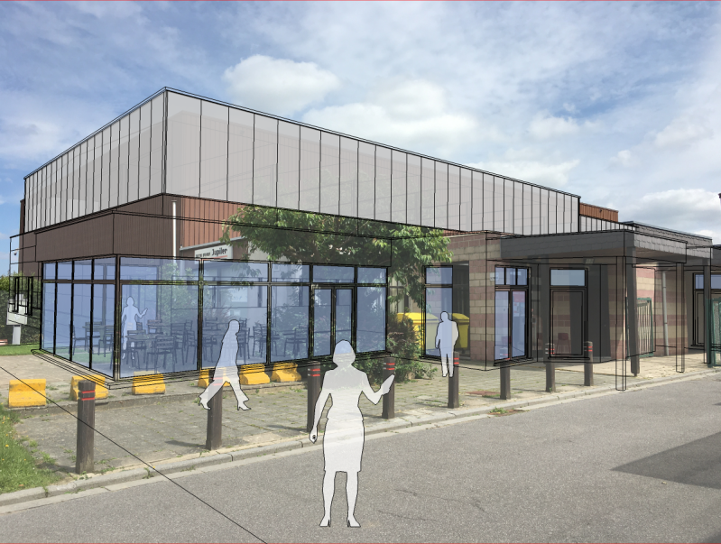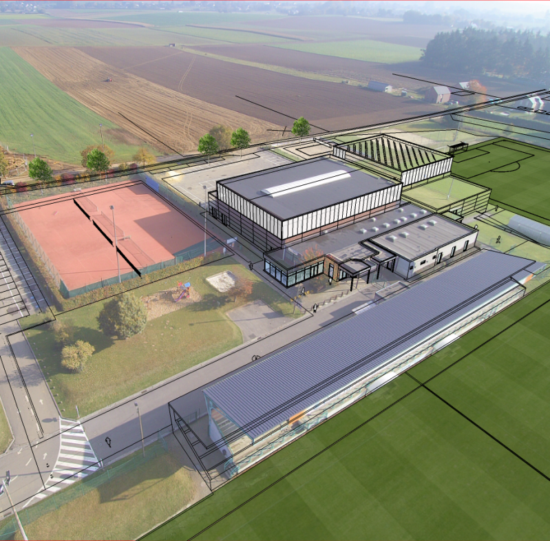 Ce projet de complexe sportif est niché au cœur d’un vaste site récréatif et sportif qui sert de porte d’entrée Est du village. L'enjeu de cette intervention de rénovation et d'agrandissement était de maintenir, tout de même, une activité puisqu'elle constitue le seul gymnase du village. C'est pour cette raison que la seconde salle prend la forme d'un volume secondaire mis à distance du principal, par des rangements, en vue de permettre un phasage des travaux. Concernant l'espace existant, comprenant la cafétéria, les vestiaires et la "grande salle". Cette dernière était dépourvue de lumière naturelle directe, dans l'intention d'y en amener sans commencé à découper les façades, un cube translucide en polycarbonate, permettant de filtrer la lumière et ne pas gêner les sportifs a été mis en place, couronnant le volume de manière harmonieuse et redessinant le bâtiment dans le paysage urbain. Enfin, la cafétéria a été prolongée par un volume vitré afin d'enfin lui doter d'un espace généraux et tournée vers l'extérieur.
